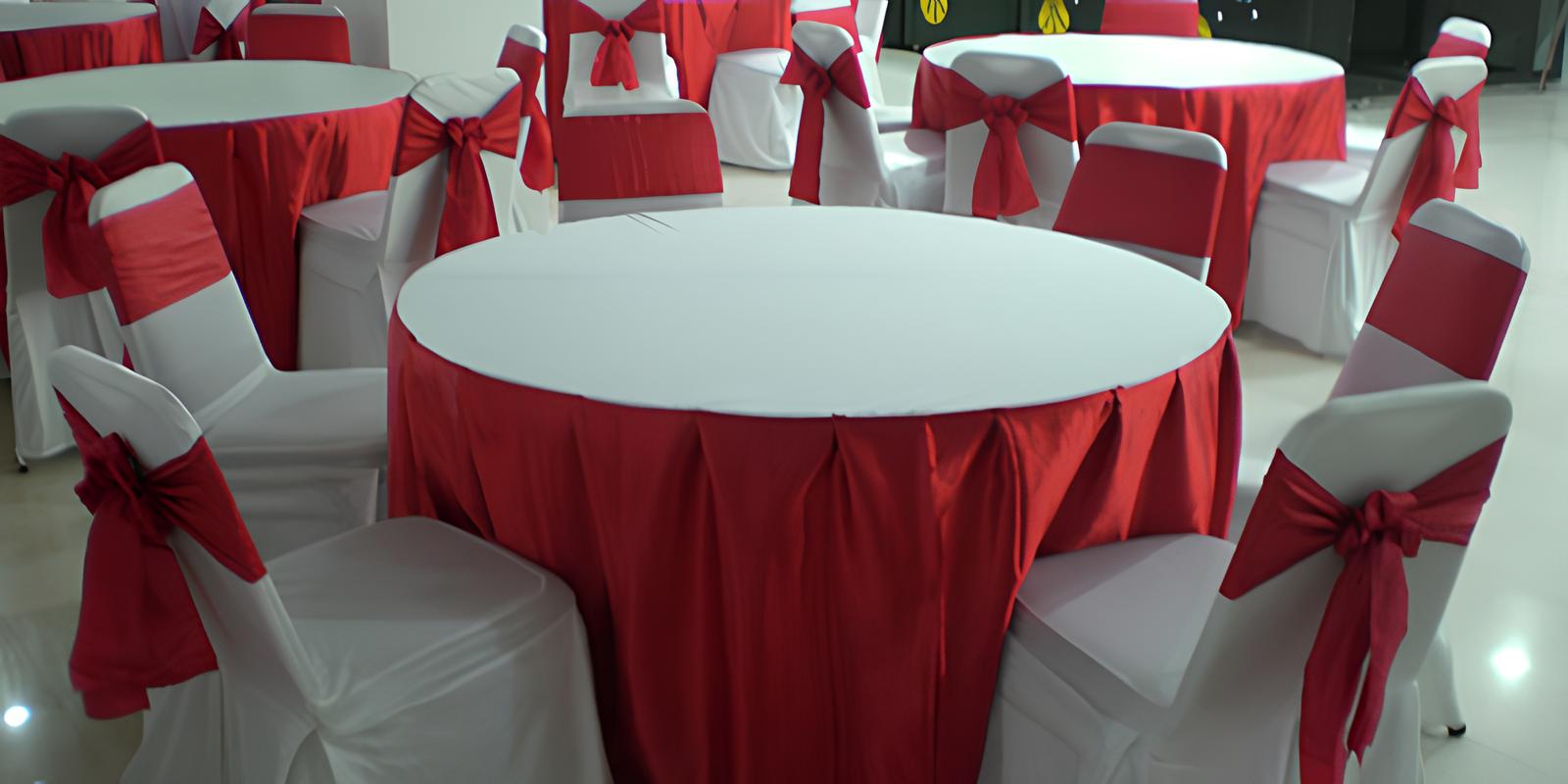 Tersedia Meja Bulat maupun Meja Kotak, dengan balutan Cover yang menawan dan warna yang sesuai selera anda